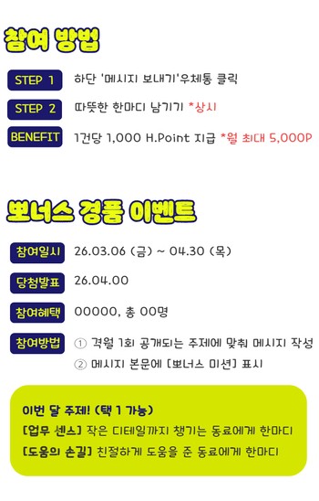 메시지 1건 당 1,000 H.Point 지급 *월 최대 5,OOOp, 상시운영 *상단 'Mypage' 탭에서 나의 참여 이력을 확인할 수 있어요.